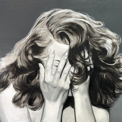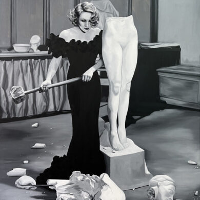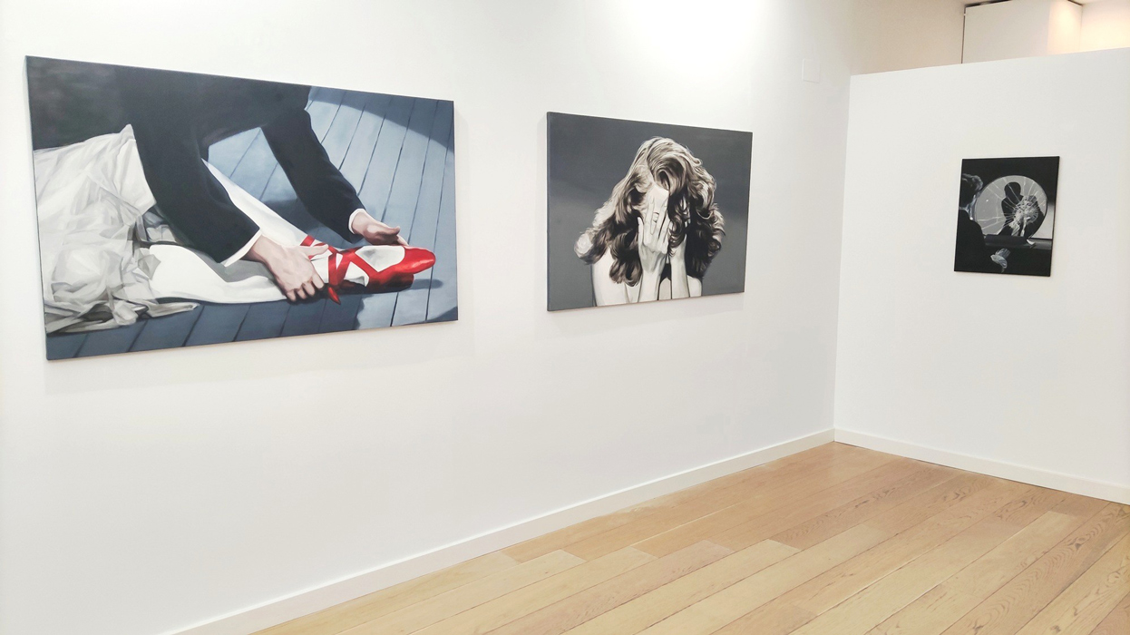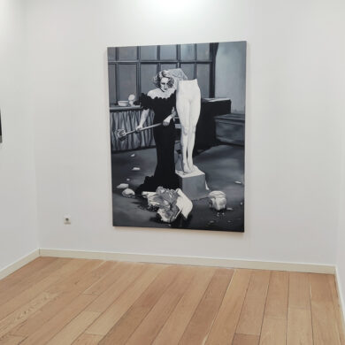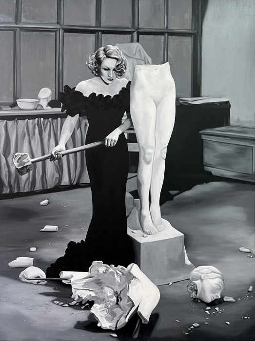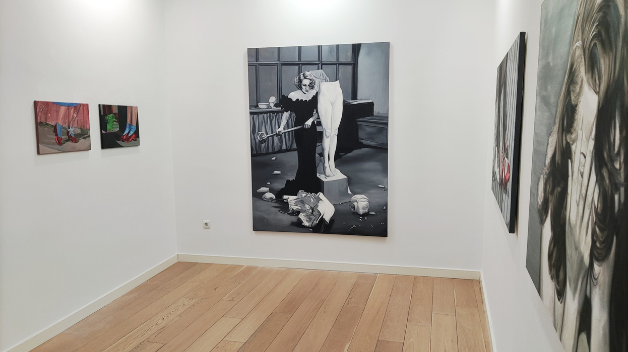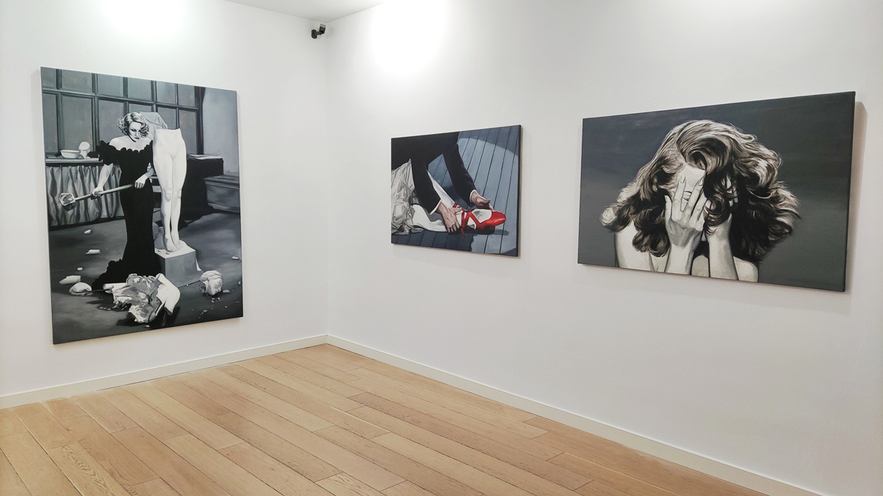A couple of years earlier, in 1944, Gaslight, Georges Cukor’s film in which Ingrid Bergman plays a woman manipulated by her husband, who makes her believe she is going insane, was released. Film historian José Luis Sánchez Noriega points out in an essay on film noir that the actress ‘’had to demand, even to the point of tears, that producer Selznick include her name in the credits with the same prominence as Charles Boyer’s (her co-star)’’. Bergman, doubly a victim, in reality and in fiction. In neither life is there any escape from the role. Cristina Toledo transfers stills from Hollywood films to the canvas with the aim of generating a new perspective. The old answers are no longer sufficient for the new questions. She urges us to break free from the autopilot of unquestioning acceptance and to activate self-awareness. Vivian Gornick defines this concept as ‘’the feminist practice of examining one’s own personal experience from the perspective of machismo, the theory that explains the subordinate position of women in society as a result of the cultural decision to confer direct power on men and indirect power on women’’. While the system shouts at you to be feminine and smile, the artist seeks to deactivate sins (Norma Jeane is not to blame) and set in motion the mechanism of self-awareness that will drive us to be our own masters so that no one tells our story for us.”